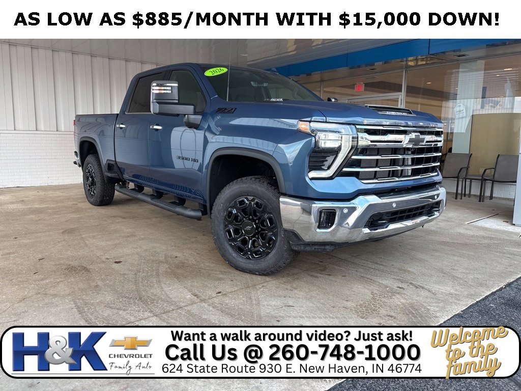 H&K Chevrolet has been family owned and operated for over 70 years. With our recently acquired New Haven location, we started our business in a town of 4,000 people, and carry forward over 70 plus years of success from our Continental location. We prioritize customer service, honesty, and up-front pricing to provide the easiest buying experience possible. At H&K Chevrolet, we are committed to building lasting relationships with our customers that extend beyond sales and service. Disclaimer: Payment shown above is based on financing for 84 months at 6.9% APR or applicable GM Financial promotional rate, whichever applies. Payment calculations assume qualification for GM Employee Pricing. All offers are subject to credit approval and may vary depending on individual credit history. Not all customers will qualify. Lakeshore Blue Metallic 2026 Chevrolet Silverado 3500HD LTZ 4WD 10-Speed Automatic 6.6L V8 10-Speed Automatic, 4WD, Jet Black Leather.