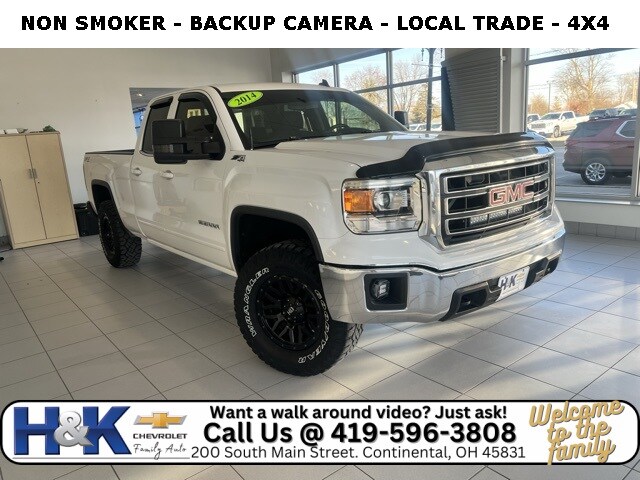 H&K has been family owned and operated for over 60 years. Quietly located in NW Ohio, in a town of 900 people. Customer service and honesty, are top priorities at H&K. We price our vehicles honestly, and straight forward to give you the easiest buying experience possible. *** Local Trade***, *** Fully Serviced, Cleaned, and Guaranteed***, Sierra 1500 SLE, Double Cab, EcoTec3 5.3L V8 Flex Fuel, 6-Speed Automatic Electronic with Overdrive, Summit White, 150 Amp Alternator, 4.2" Diagonal Color Display Driver Info Center, Body Color Bodyside Moldings, Body Color Door Handles, Body Color Power-Adjustable Heated Outside Mirrors, Chrome Grille Surround, Color-Keyed Carpeting w/Rubberized Vinyl Floor Mats, Deep-Tinted Glass, Driver & Front Passenger Illuminated Vanity Mirrors, Electronic Autotrac Transfer Case, EZ Lift & Lower Tailgate, Front Frame-Mounted Black Recovery Hooks, Heavy-Duty Rear Locking Differential, Leather Wrapped Steering Wheel w/Cruise Controls, LED Cargo Box Lighting, Manual Tilt Wheel Steering Column, OnStar 6 Months Directions & Connections Plan, Power Windows w/Driver Express Up, Preferred Equipment Group 3SA, Rear 60/40 Folding Bench Seat (Folds Up), Rear Vision Camera w/Dynamic Guide Lines, Rear Wheelhouse Liners, Remote Keyless Entry, Single Slot CD/MP3 Player, Single-Zone Air Conditioning, Steering Wheel Audio Controls, Trailering Equipment.